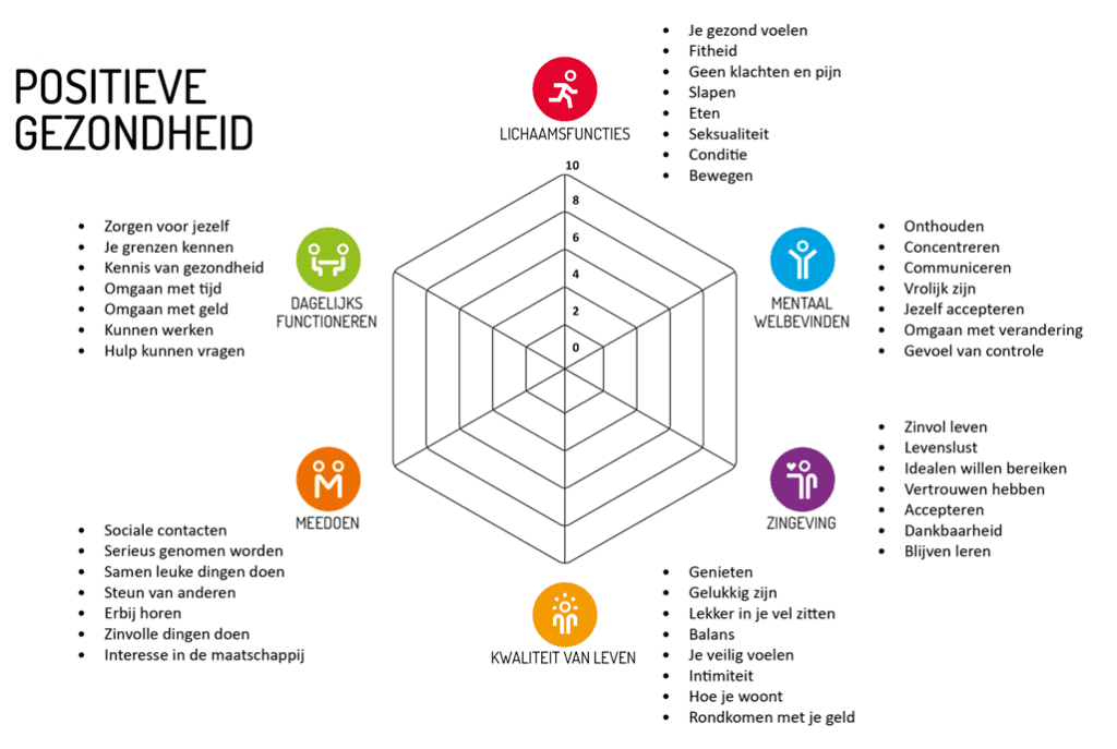 Binnen de integrale en mensgerichte werkwijze staat het gedachtegoed van Positieve Gezondheid centraal. Deze benadering kijkt breder dan alleen de medische kant van ziekte en richt zich op zes dimensies van gezondheid: lichamelijke functies, mentaal welbevinden, zingeving, kwaliteit van leven, meedoen en dagelijks functioneren. Patiënten worden gestimuleerd om zelf regie te nemen over hun gezondheid, met ondersteuning van een netwerk van zorg- en welzijnsprofessionals. Deze ondersteuning wordt gecoördineerd door de verpleegkundig telecoach, die laagdrempelig bereikbaar is via de BeterDichtbij en Patient Journey App. Gaat het even iets minder goed, dan is er de ‘zonodig meting’: een persoon houdt altijd de kans om bij terugval weer gezien te worden door een behandelaar. Wanneer iemand het installeren van apps last vindt, staat de Helpdesk Digitale Zorg altijd klaar om te helpen.