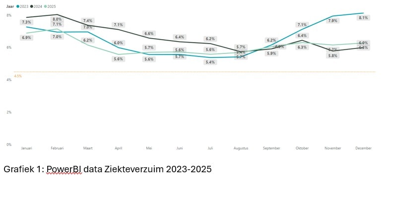 Tussen 2022 en 2025 is de aanpak stap voor stap opgebouwd: de rolverdeling rond verzuim werd verlegd naar leidinggevenden (met ondersteuning van HR-adviseurs), definities en datakwaliteit werden organisatiebreed vastgezet en dashboards maakten sturing op teamniveau mogelijk.